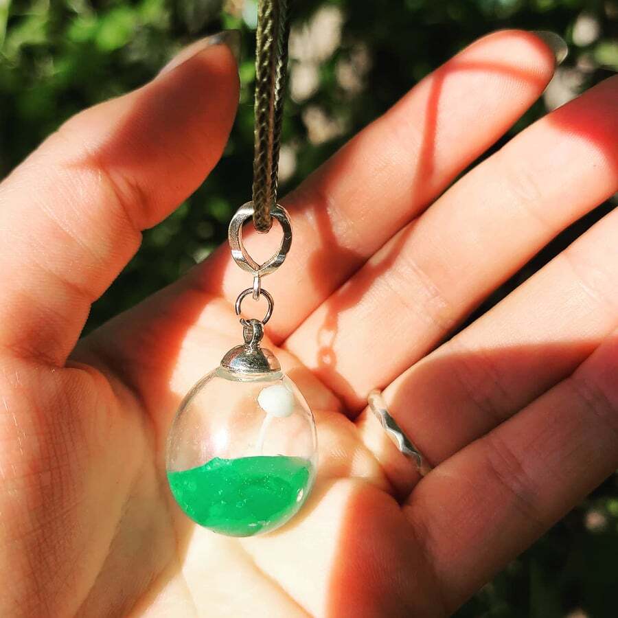 Green forest magic lies captured to nourish mushrooms. It is random how many mushrooms are in each tiny globe. Outer globe is plastic, inside is resin.