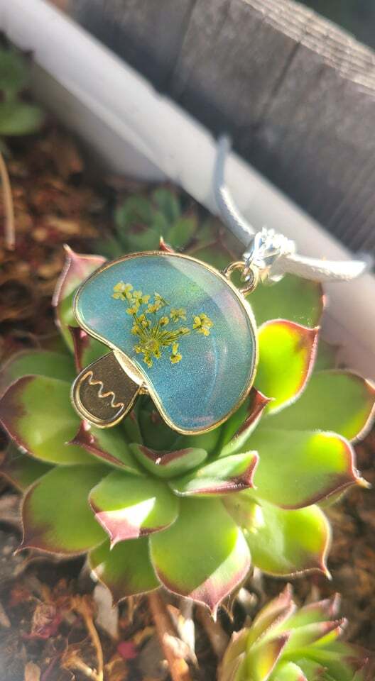 This is a blue mushroom resin pendant with yellow flower. Each pendant with flower inclusions tends to be unique due to placement and flowers.