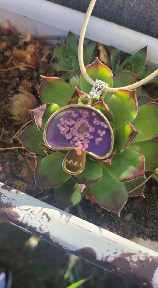 This is a purple mushroom resin pendant with pink flower. Flower designs are individual per flower and manufacture is seasonal for real flowers.